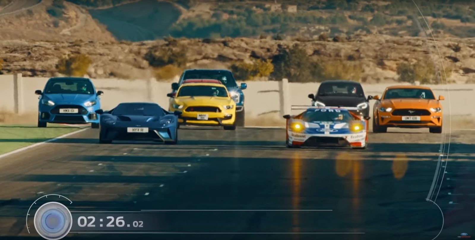 Voor deze spectaculaire showdown werden de Ford Performance-modellen stuk voor stuk bestuurd door professionele coureurs van het Ford Chip Ganassi Racing Team. Op het 5,345 km lange Motorland Aragón-circuit in Spanje namen de drie coureurs van het WEC-team en vier van het IMSA-team plaats in de Ford F-150 Raptor, de vorige generatie Fiesta ST, de gloednieuwe Fiesta ST, de Focus RS, de Mustang GT, de Mustang GT350R, de Ford GT en de Ford GT-raceauto.