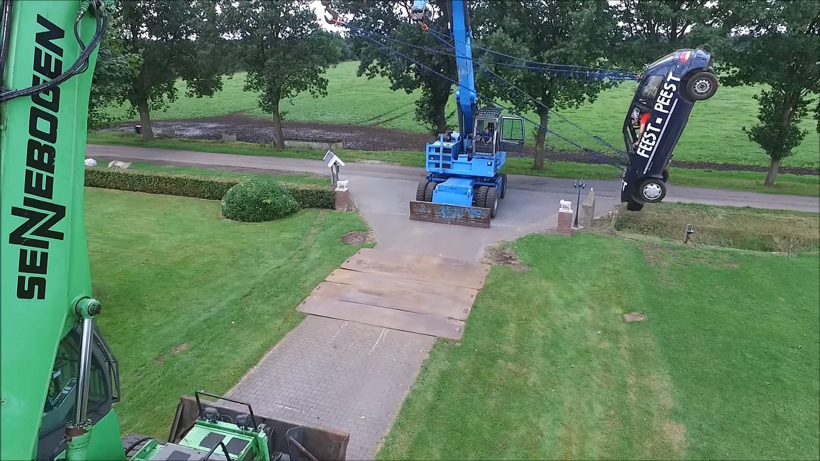 Het is vakantie. Het gevolg? Veel te veel vrije tijd. Wat doe je dan? Deze heren uit Peest in Drenthe maakten een autoschommel met behulp van twee hijskranen en een Daihatsu Charade. Let the swinging begin!