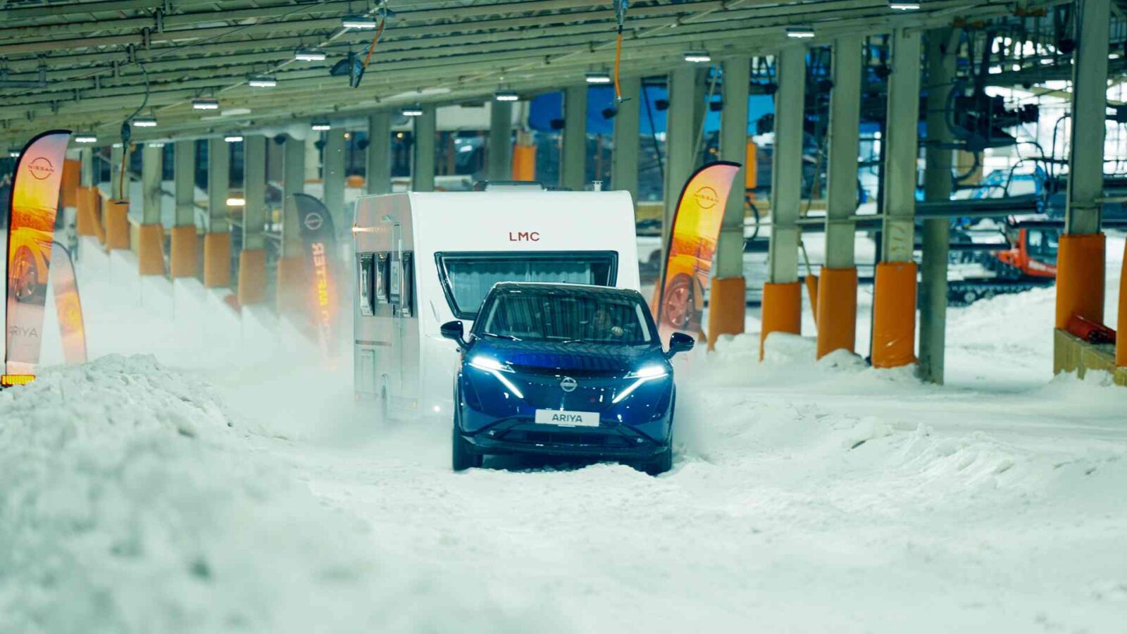 VIDEO: Nissan Ariya sleept caravan omhoog op skipiste in Landgraaf