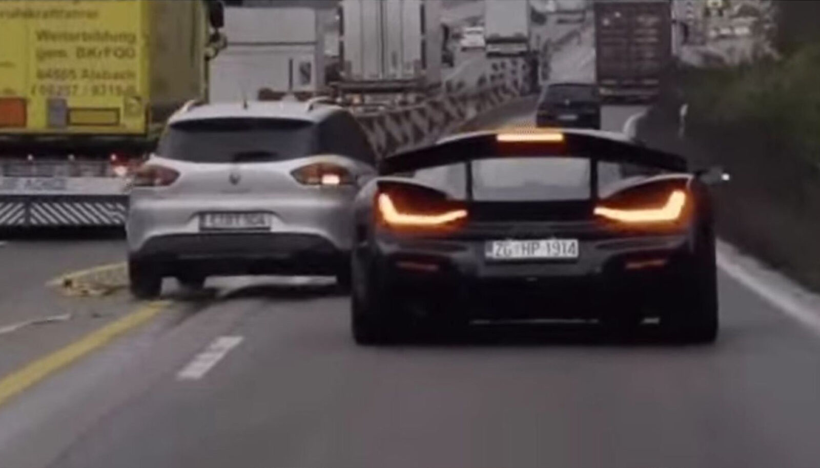 Er leek niks aan de hand, totdat de Renault onverwacht besloot een afrit te nemen. De bestuurder van de Franse auto stuurde langzaam naar rechts – precies in de richting van de hypercar. Pas op het laatste moment werd de richtingaanwijzer aangezet, in een poging om de onverwachte actie nog goed te maken.