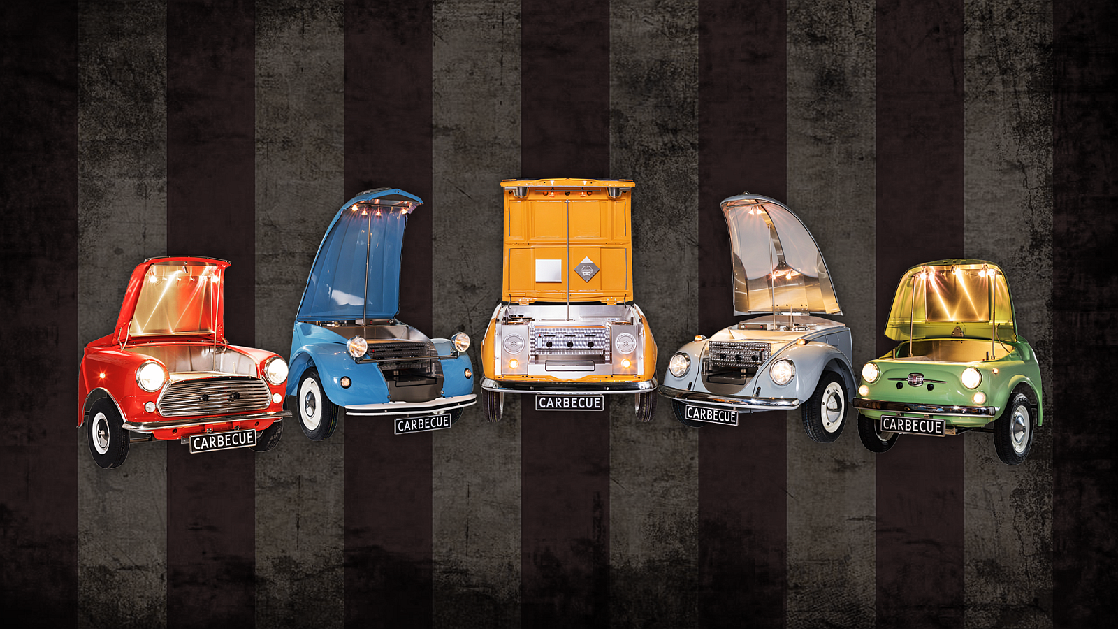 Een Mini, Kever, Citroën 2CV, Fiat 500 of Renault 4 met een barbecue in het vooronder? Het kan, het is een Carbecue en die is sinds kort te koop.
