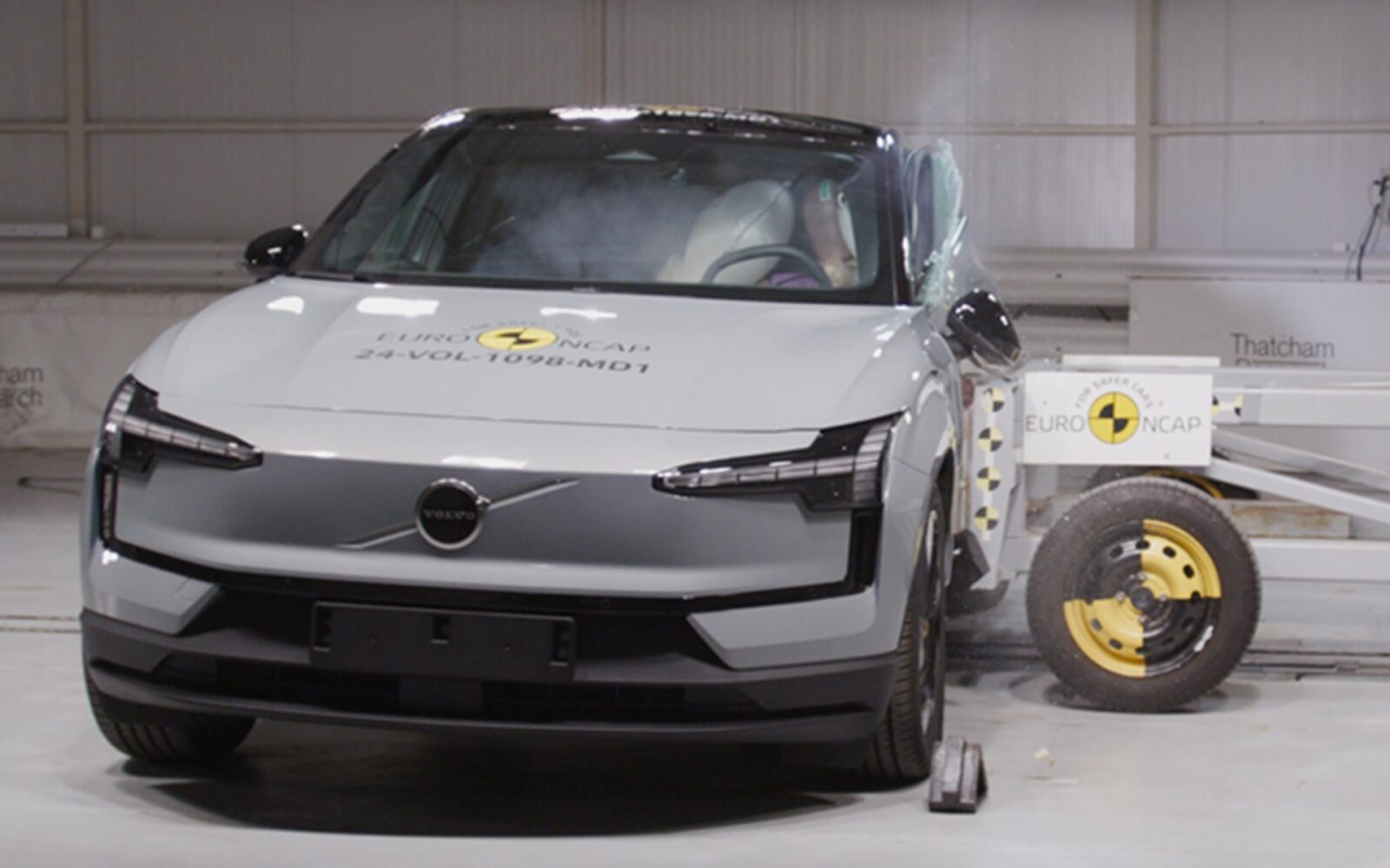 “Het passagierscompartiment van de Volvo EX30 bleef stabiel tijdens de frontale offset-test. De dummy-waarden toonden een goede bescherming van de knieën en dijbenen voor zowel de bestuurder als de passagier voorin. Volvo kon echter niet aantonen dat een vergelijkbaar beschermingsniveau zou worden geboden aan inzittenden van verschillende lengtes en zitposities, wat leidde tot een aftrek in de beoordeling. Analyse van de vertraging van het ‘impactkarretje’ tijdens de test en van de vervormbare barrière na de test liet zien dat de Volvo EX30 een vriendelijke impactpartner zou zijn bij een frontale botsing.