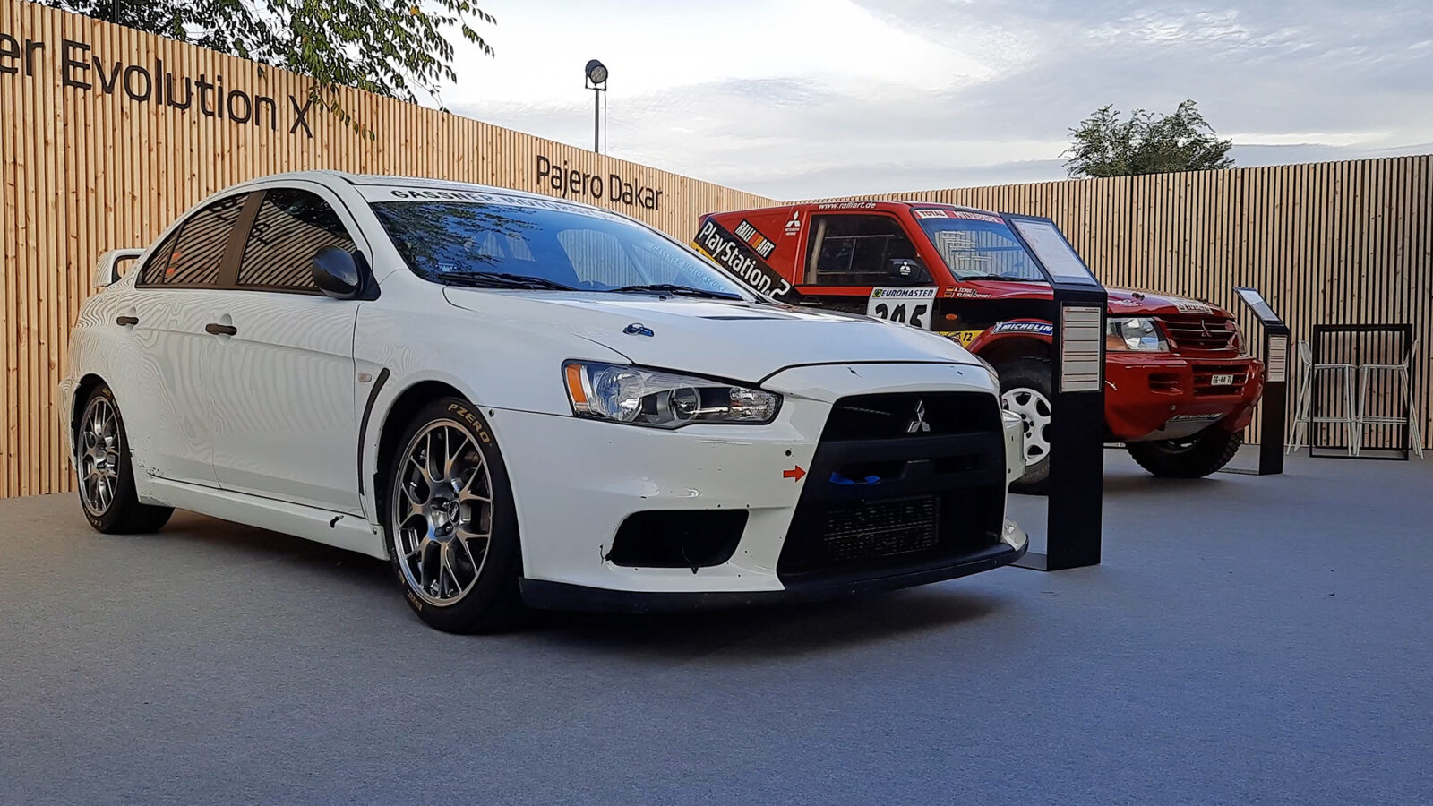 Naast de i-MiEV staan een Lancer Evolution X en een Pajero, die in 2001 de Dakar-rally heeft gewonnen. Dat Mitsubishi zijn mannetje staat op verschillende ondergronden, wordt direct duidelijk.