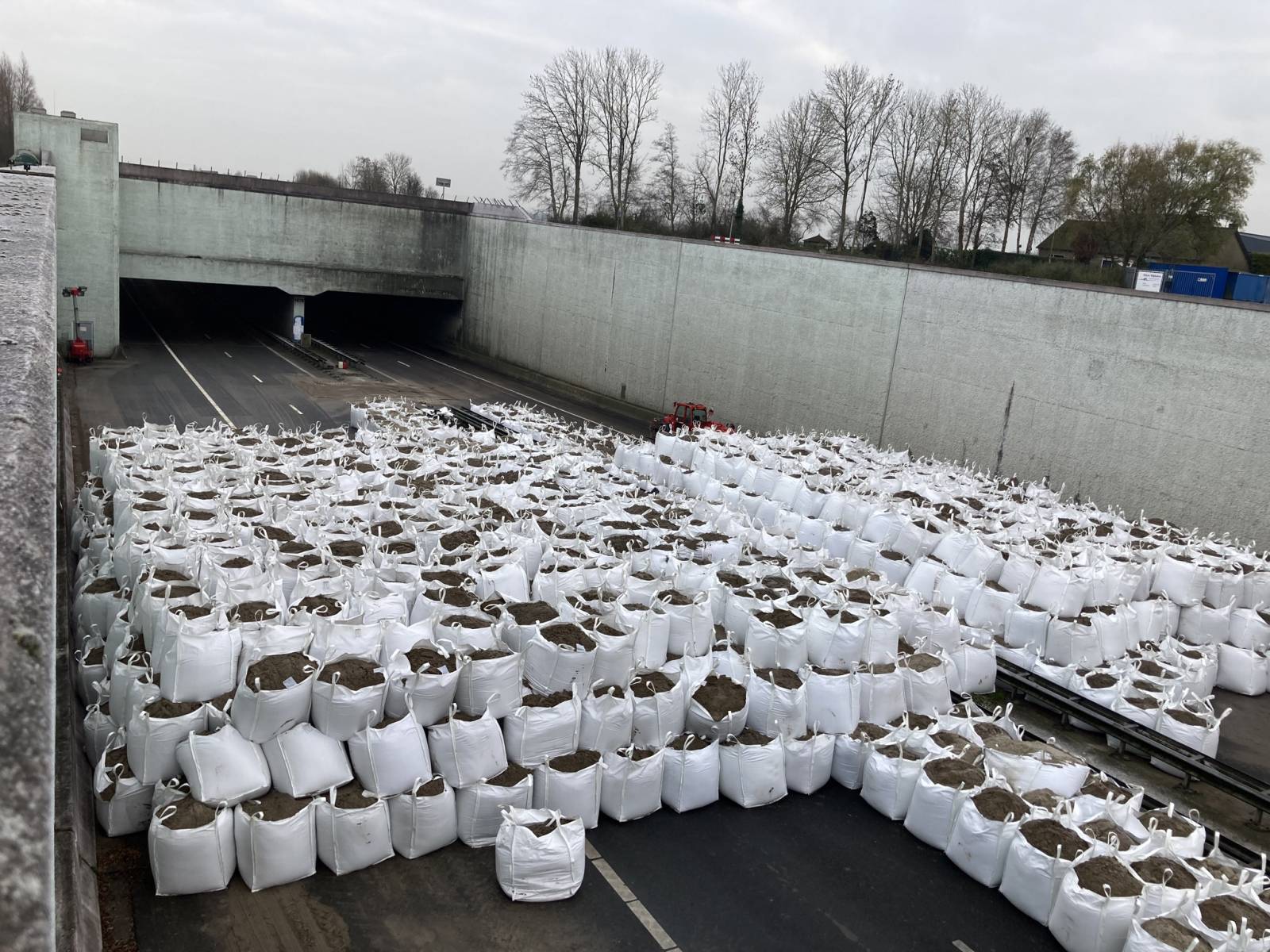 Met de zandzakken probeert Rijkswaterstaat de zogenoemde tunnelmoten te stabiliseren. De tunnelmoten samen vormen de tunnelbak en zitten vast met tientallen grondankers. Door de hoge druk van het grondwater zijn de ankers van één tunnelmoot afgebroken, waardoor een weggedeelte omhoog is gekomen.