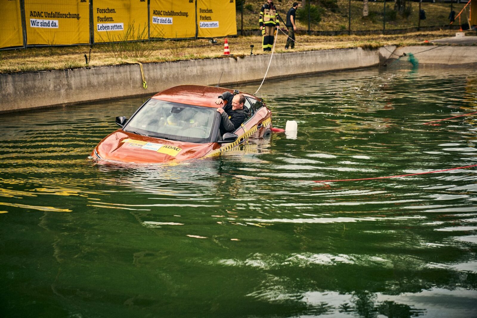 Eerst wat belangrijke basistips, of je nu een EV hebt of niet. Veel mensen denken dat je moet wachten tot je auto helemaal vol water staat, zodat de druk binnen en buiten gelijk wordt en je het portier makkelijk open krijgt. Klinkt logisch, maar de praktijk blijkt anders. Uit de ANWB-test kwam naar voren dat een auto al snel drie minuten nodig heeft om volledig te zinken. Tegen die tijd zit je al anderhalve minuut onder water. Dus wacht niet, maar onderneem direct actie zodra je in het water belandt: maak je gordel los, open je raam (of sla hem in – de hoek is het meest breekbaar) en ontsnap.